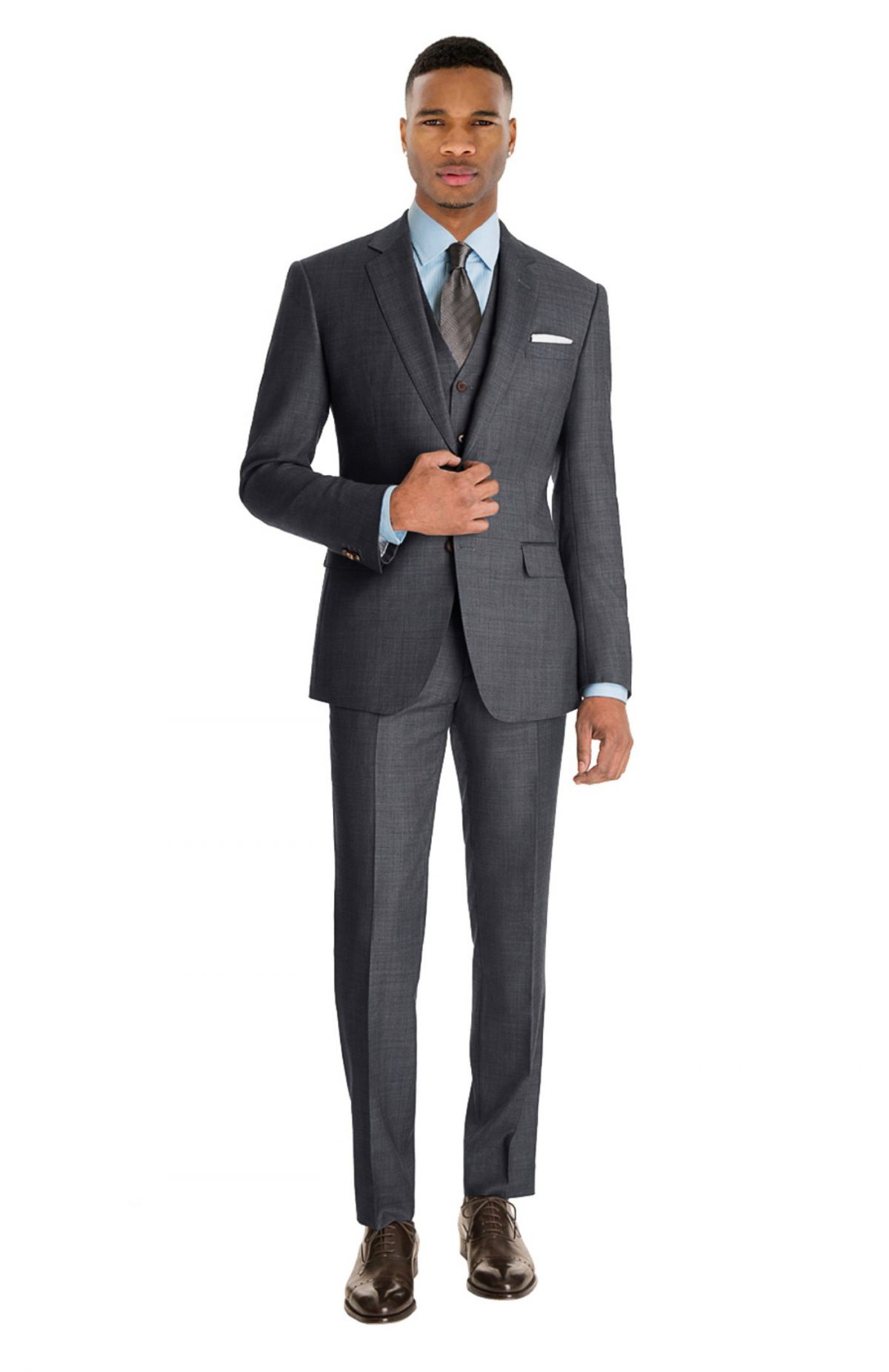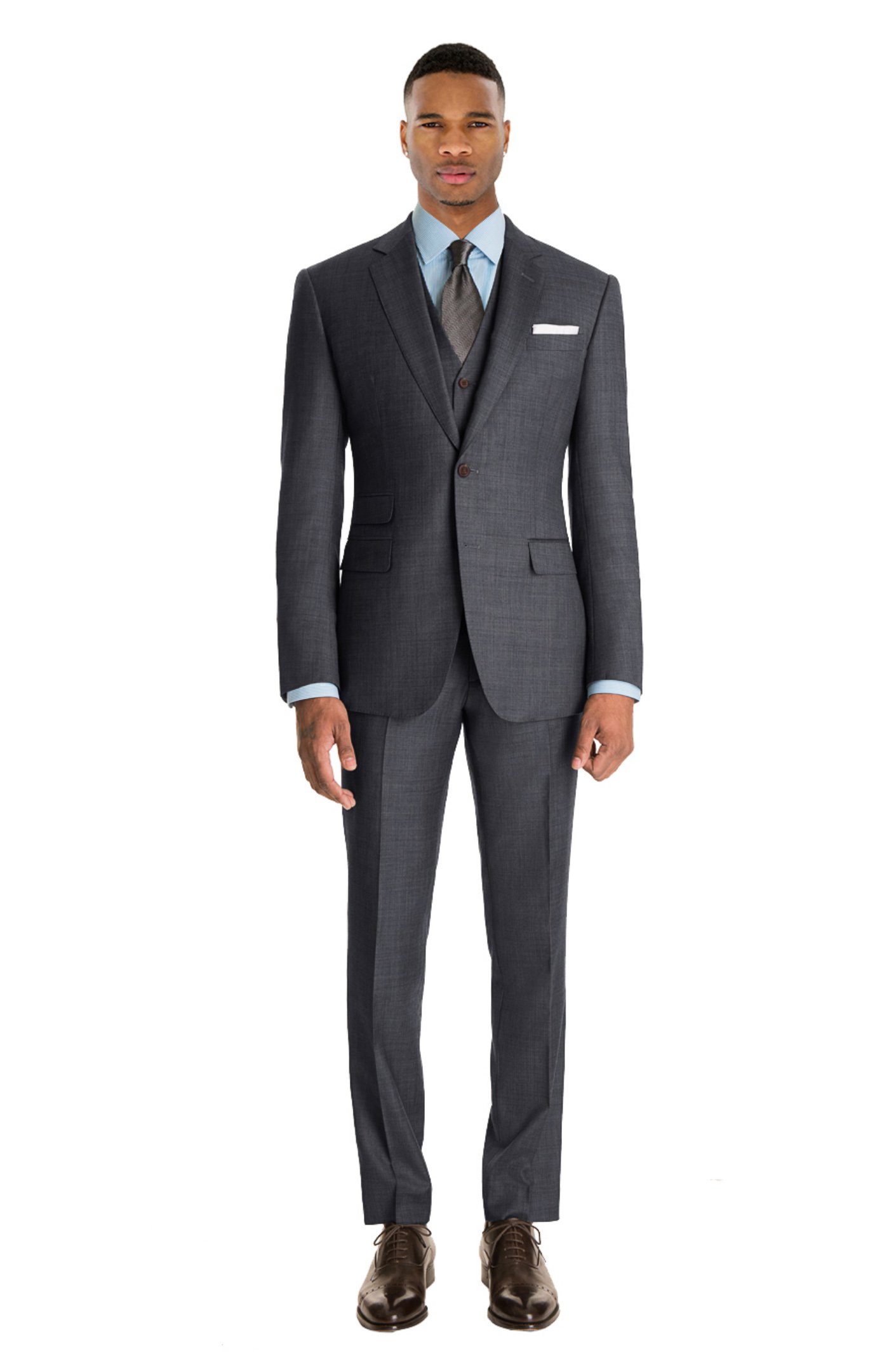By using two different shades of grey wool in a single weave, this textured fabric gives character and depth to a suit. The one presented here is composed of three pieces. The vest, which is the same colour as the jacket and pants, offers great versatility and combination possibilities, allowing the wearer to adapt to any situation. For example, on a hot day, why not take off the jacket and keep the vest to maintain a very elegant look? This is one of the many advantages offered by this three-piece suit.
